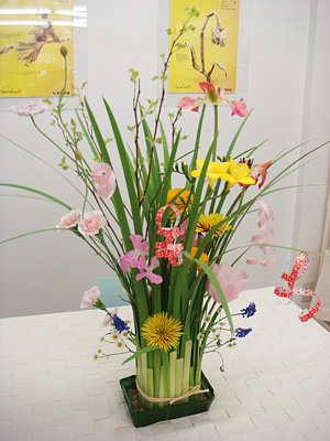 オクラレルカ(菖蒲の一種)の葉を、バラバラにしてオアシスの周りに、輪ゴムでおさえながら、柵のように立てて、ラフィアで結びます。それから、春の花々を挿していきます。チューリップ、フリージア、ラナンキュラス、糸菊、マトリカリア、スイトピー、レースフラワー、カーネーション、ムスカリ等。水玉のカーリングリボンをつけて、華やかさをプラス。春らしい香りが漂っています。
