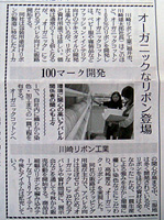 2007年10月26日(金)の日本繊維新聞に弊社のオーガニックコットンリボンの記事が、掲載されました。 This article on our organic cotton ribbon was published in the NIHON SEN-I SHIMBUN(daily newspaper for fashion business)on Friday,October 26,2007.