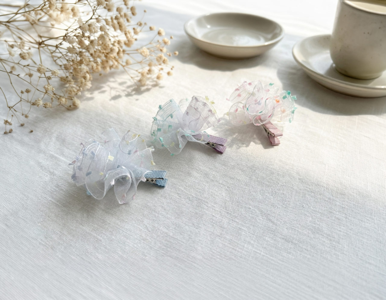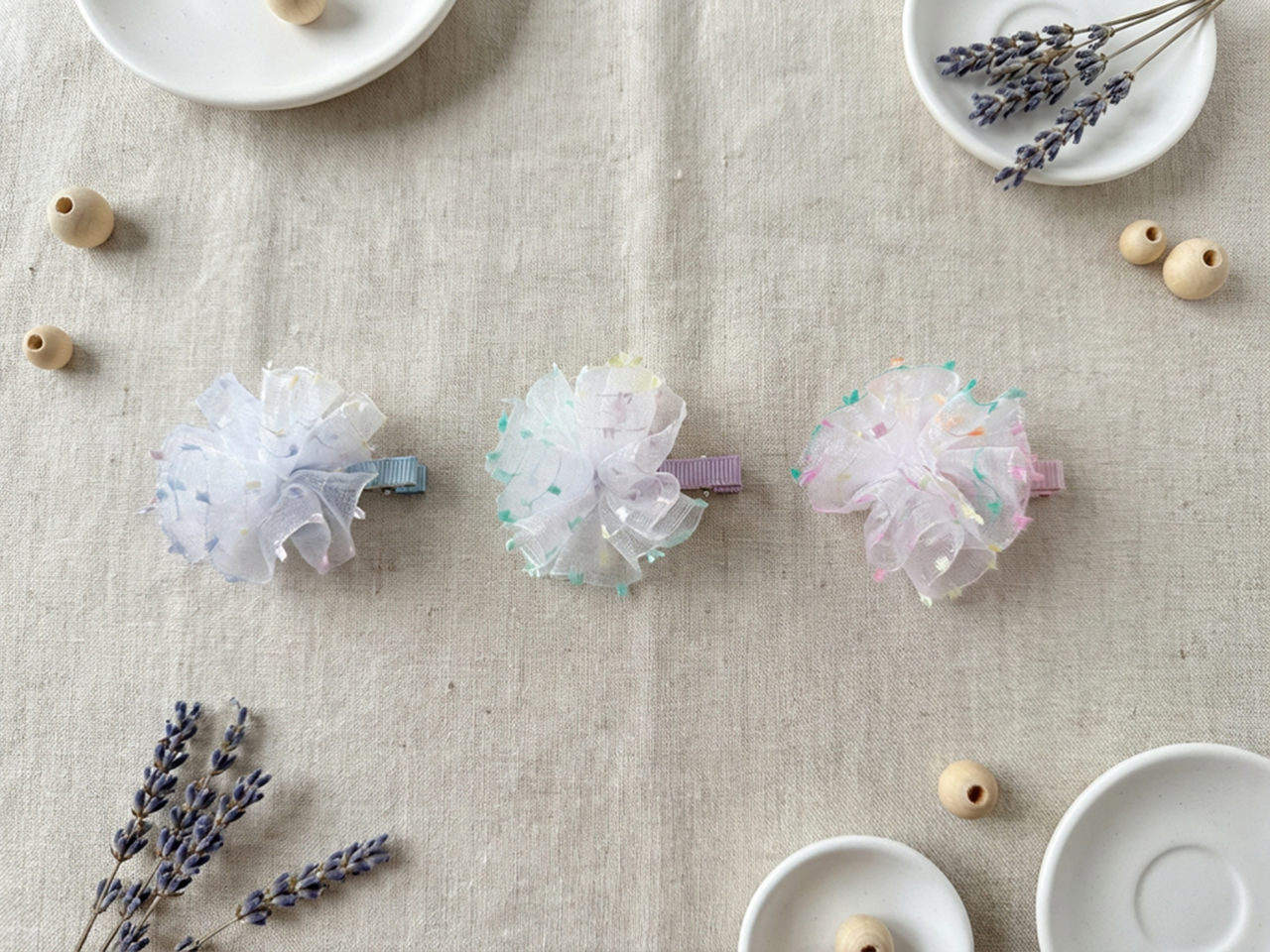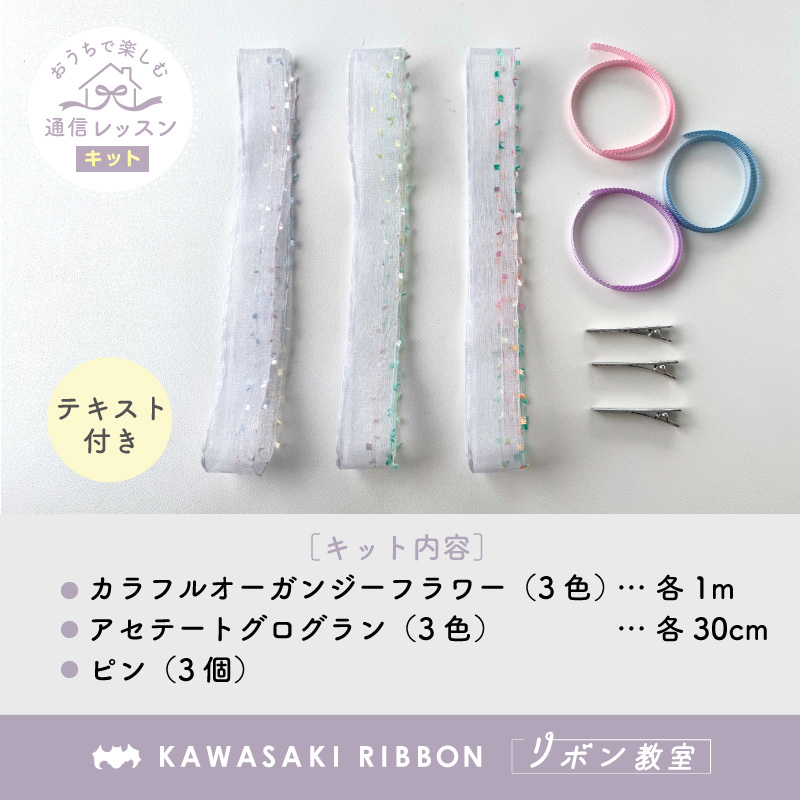 川崎リボン工業の『カラフルオーガンジーフラワーリボン』を使用した、繊細な透け感とやわらかな色彩が魅力のヘアピン作りです。